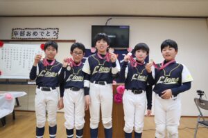 監督から卒部証書、記念品授与が行われ、OBも駆けつけてくれてプレゼントも🎁